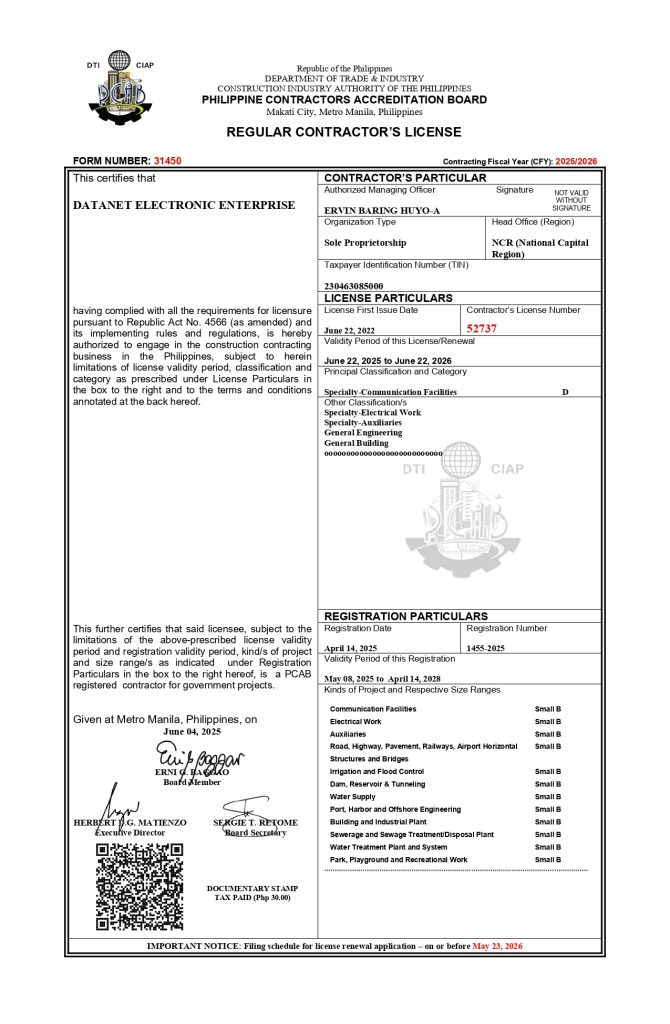 We are a system integrator dedicated to delivering reliable and cost-effective technology solutions. We take pride in our expertise, professionalism, and commitment to customer satisfaction. Our PCAB License affirms our capability to undertake projects with compliance to national standards and industry regulations.